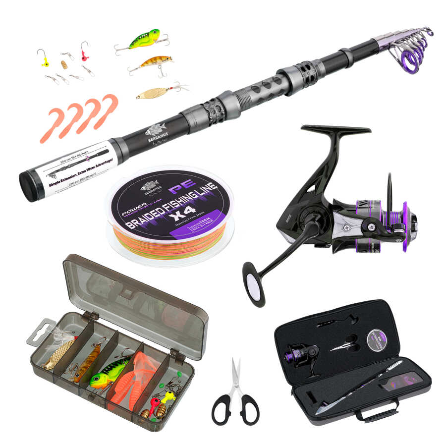 Serranus Balıkçı Seti, şık tasarımıyla hem yeni başlayan hem de deneyimli balıkçılar için tasarlanmış kompakt bir av çözümüdür. 240 cm teleskopik kamışı kapandığında yalnızca 40 cm uzunluğa düşer, bu sayede çantada, arabada ya da elde rahatlıkla taşınabilir. Sapındaki +10 cm ek segment, gerektiğinde atış mesafenizi artırarak daha geniş alanlarda verimli av imkânı sunar. 3+1 bilyalı 3000’lik olta makinesi, pürüzsüz sarımı ve güvenilir fren sistemiyle av sırasında maksimum kontrol sağlar.