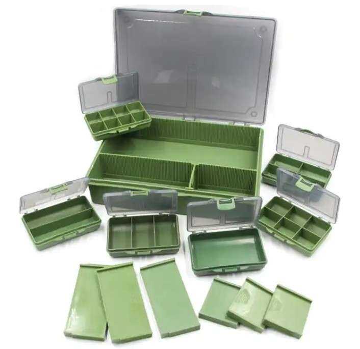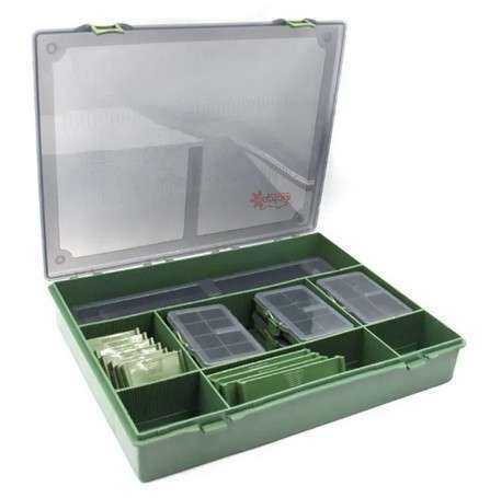 Tüm sazan balıkçılarının ihtiyaçlarına uygun, güzel mat yeşil renkte ve yarı şeffaf kapaklı, güçlendirilmiş, darbeye dayanıklı naylon plastikten yapılmış üç farklı takım kutusu. Tüm modellerde, bölmelerin boyutunu istediğiniz gibi değiştirebilmeniz için çıkarılabilir bölücüler bulunur ve her şeyi elinizin altında ve iyi organize etmenize yardımcı olmak için takımlar için ek aksesuar saklama kutuları ile birlikte verilir. seyahat eden sazan balıkçıları veya hafif seyahat etmeyi seven herkes için mükemmel bir seçimdir,