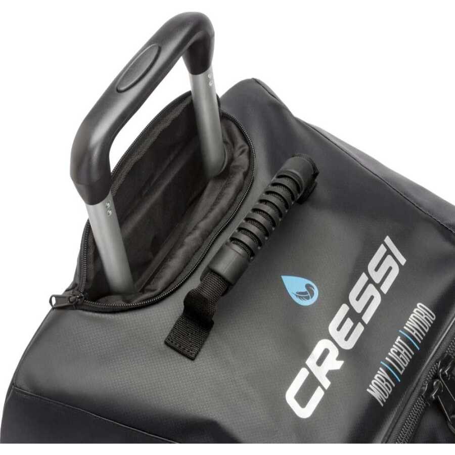 Cressi Moby Light Hydro Tekerlekli Dalış Çantası, sağlam su geçirmez malzemeden yapılmıştır. Ana bölme, kolay erişim sağlayan üç taraftan açılır. Güçlendirilmiş çekme kolu teleskopiktir ve tamamen geri çekilebilir. Torbanın arkası, Cressi Moby Light Hydro tekerlekli dalış çantasını dikey bir konumda tutmak için destek çubuklarını barındırır. 73cm x 41cm x 30cm ölçülere sahiptir. 3.8kg ağırlığı bulunmaktadır.