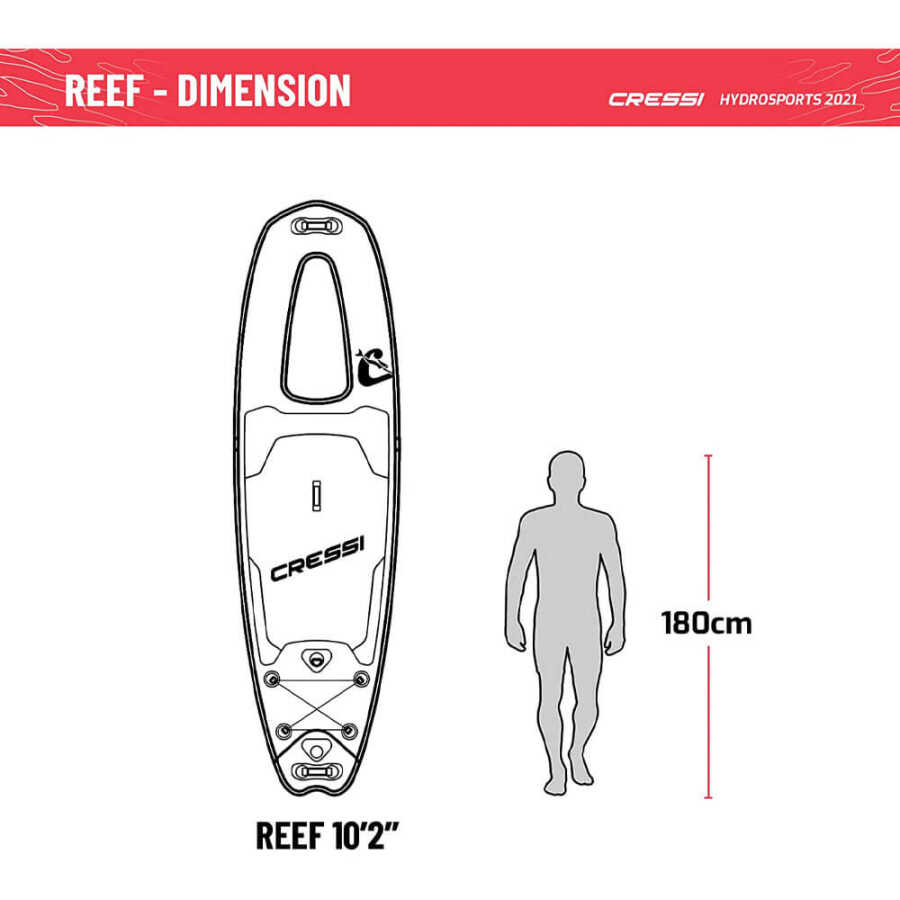Yüzeyin üstünden tam şnorkelle yüzme deneyimi: su altı ortamını maksimum saygıyla karşılamak ve gözlemlemek için yeni bir bakış açısı. Bu Reef, şimdiye kadar ki en büyük pencereye sahip yeni Cressi Window ISUP. Önceden lamine edilmiş malzemeyle birleşen büyük 86cm - 34" "balık" şekli, kürek çekme konumundan pruvaya kadar uzanan ve Crystal Clear PVC'nin sağlam tabakası sayesinde uzun bir pencere tasarlamamızı sağladı, Reef'in penceresi, geziniz sırasında size deniz tabanının olağanüstü bir manzarasını sunar. Yüksek kaldırma kuvveti, kavisli yay siz nereye giderseniz gidin denizi rahatlık içinde hayranlıkla izlemenizi sağlamak için tahtaya büyük bir denge sağlar.