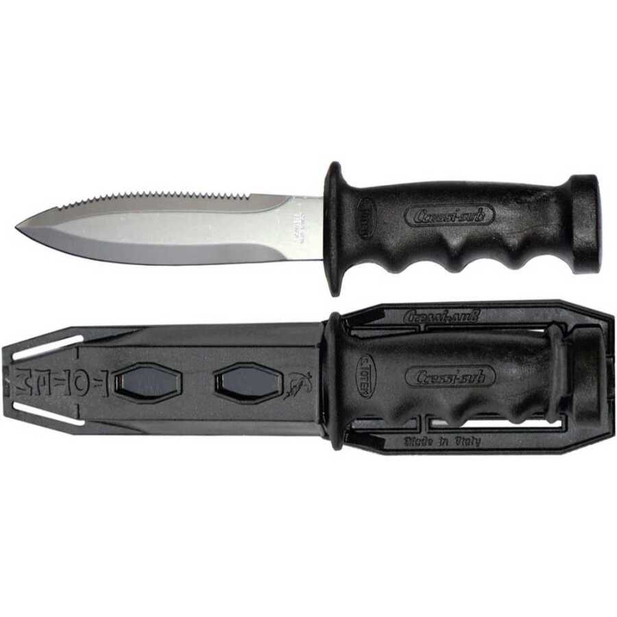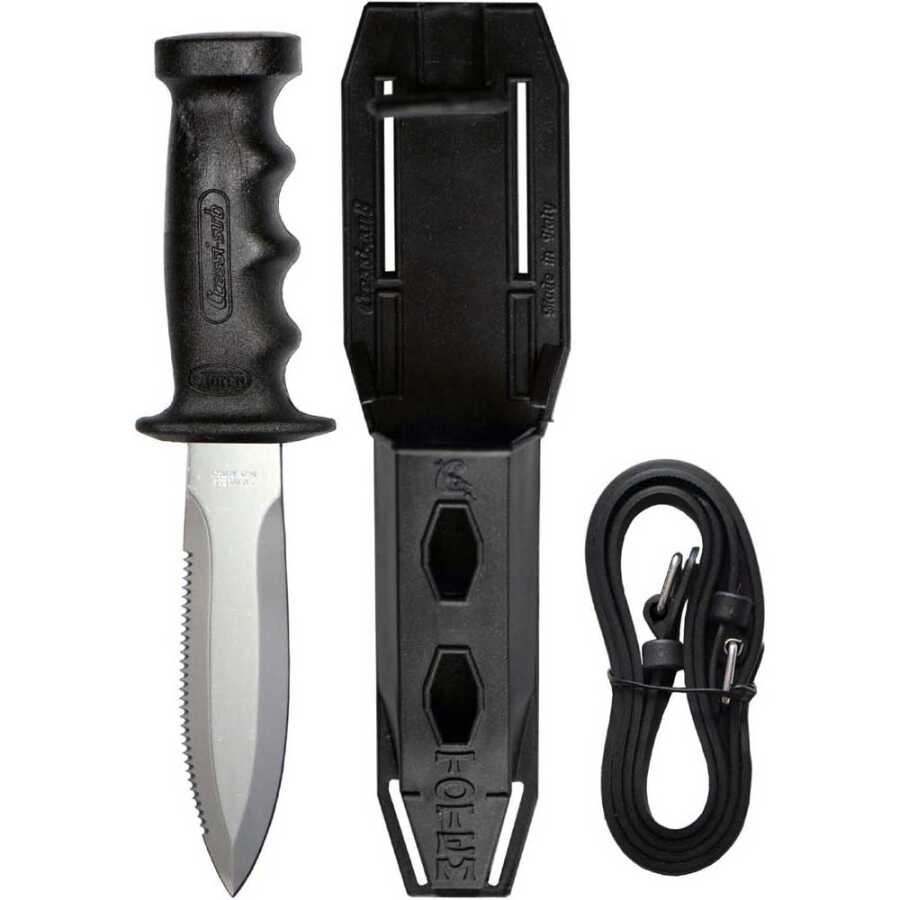 Paslanmaz çelik bıçağın bir tarafı düz kenarlı, diğer tarafı ise bıçağın tam boyunca testere dişli şekildedir; her ikisi de oldukça keskin ve misina kesme için etkilidir. Anatomik kavrama, teknopolimerlerden yapılmış olup parmaklar için bir dizi kalıba sahiptir ve bıçağın sonunda bir başparmak koruma tabına sahiptir. Plastik kılıf, geleneksel bir elastik bant ile bıçağı sıkı bir şekilde tutar ve bacağa veya kayışa bağlamak için halkalara sahiptir. Bıçak, bacağınıza bağlamak için standart iki adet kayış ile birlikte gelir.