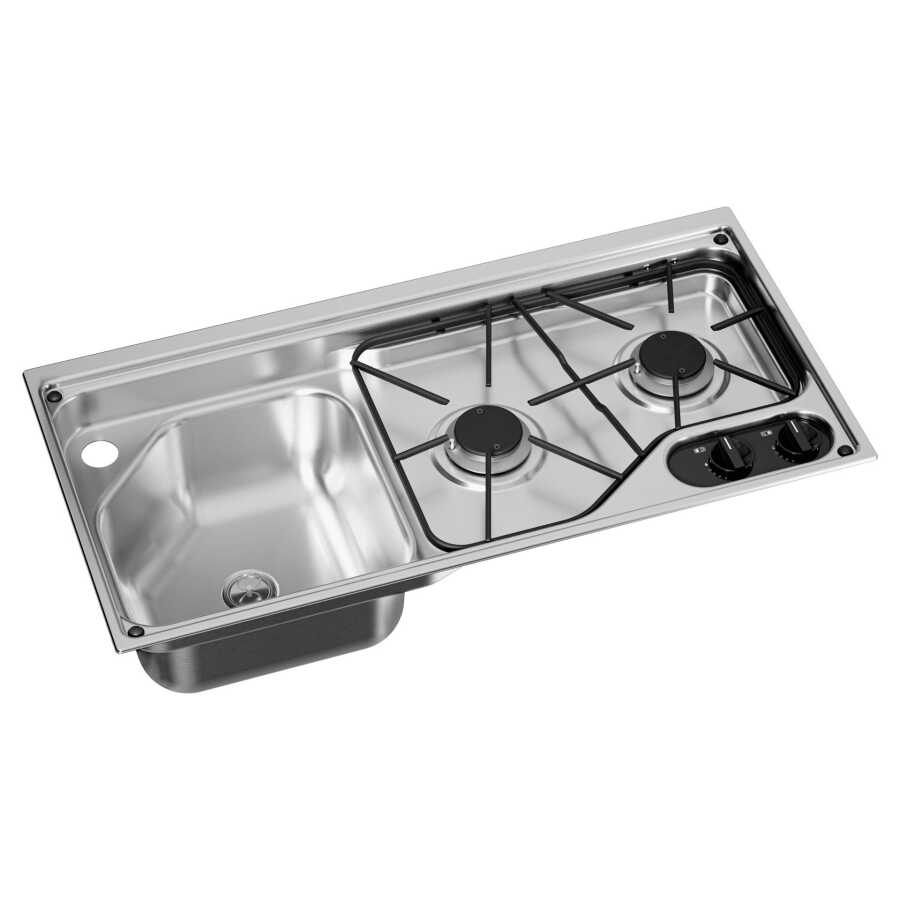 Description :Bu kompakt iki gözlü gazlı ocak ve sol tarafta evye kombinasyonu, küçük alanlara pratik mutfak çözümleri sunar. Paslanmaz çelik yüzeyler, çıkarılabilir emaye tava destekleri ve brülör kapakları sayesinde temizlik son derece kolaydır. Musluk ayrı satılır.