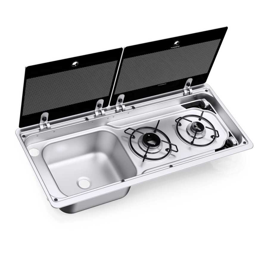 Description :Bu kompakt iki gözlü gazlı ocak ve evye kombinasyonu, en küçük alanlara bile kullanışlı mutfak çözümleri sunar.