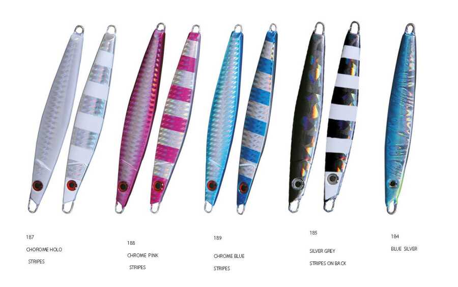 Tuzlu suya dayanıklı tek iğneli paslanmaz çelik VMC ile donatılmış olan muhteşem bir metal jigdir. Tatlı su için de uygundur. Her iki tarafında da farklı yeni renkleri ile muhteşem bir katildir (Bir tarafı çizgili diğer tarafı tam renklidir. Gümüş üründe floresan çizgiler bulunmaktadır). Bu muhteşem renk efektleri avcıları çılgına çevirir. Dikey seğirtme için kullanılabilir ancak iskelede avlanma ve casting için de uygundur.