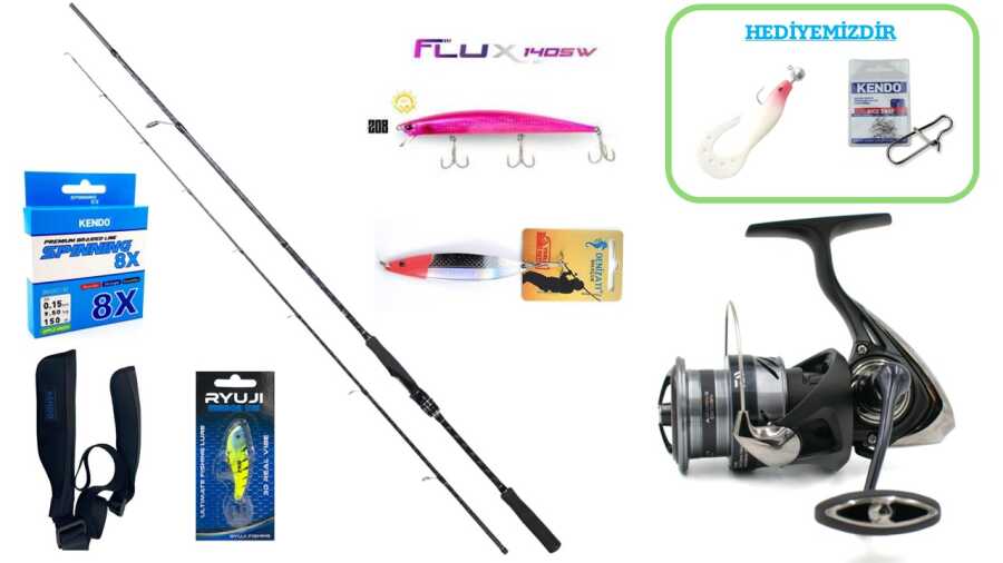 Kutu içerisinden çıktığı anda kullanıma hazır olan bu set, Kendo Spinning 8X Fighting 150 m Apple Green örgü ip ile makineye önceden sarılı olarak gelir. Kamış koruma kılıfı, sahte yemler ve aksesuarlarıyla birlikte balık avına eksiksiz bir başlangıç yapmanızı sağlar.