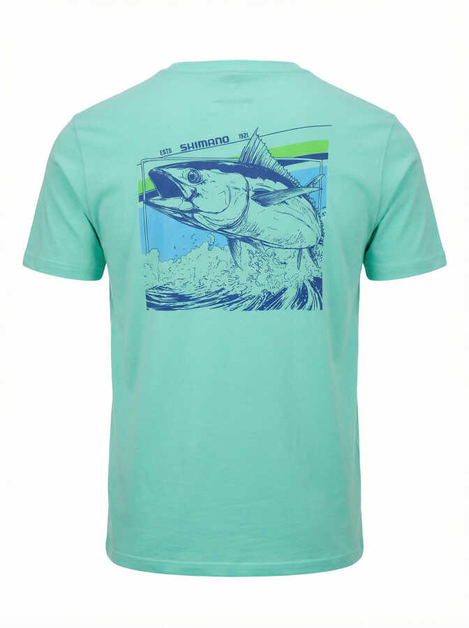 Tuna Grafik Tasarımı: Sırt kısmındaki estetik orkinos (tuna) grafiği ve göğüs bölümündeki ikonik Shimano logosu ile denizde veya şehirde tüm dikkatleri üzerinize çeker.
