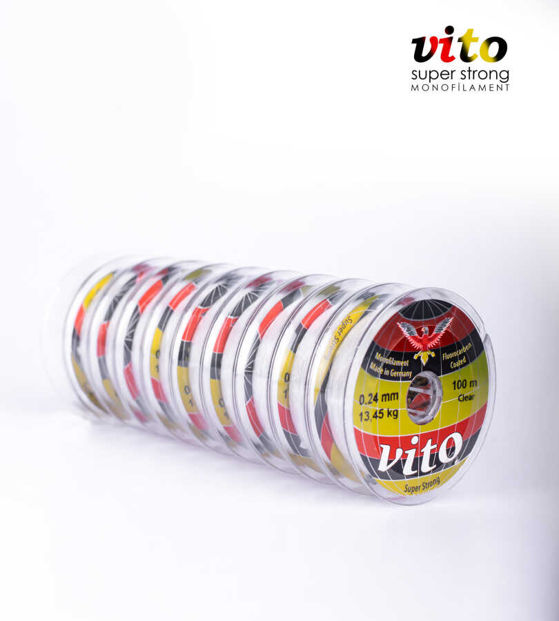 Alman mühendisliği ile üretilmiş Vito Süper Strong Monofilament Misina, hem amatör hem profesyonel balıkçılar için yüksek performans sunuyor. Set içerisinde 10 adet yekpare 100 metrelik (Toplamda 1000m) misina bulunur. Fluorocarbon kaplaması sayesinde suda minimum görünürlük sağlarken, balıkların oltadan şüphelenmesini engeller. Homojen yapısı ve düşük hafıza özelliği, kolay düğümlenebilme ve dolaşma riskinin azalması anlamına gelir. Yüksek kopma mukavemeti ve elastikiyet ise büyük balıklarla mücadelede güven verir. Ayrıca bu seri, farklı av ortamlarına uyum sağlayabilmeniz için 3 renk seçeneği ile sunulmaktadır: Şeffaf (Transparan): Doğal görünüm için ideal. Yeşil: Bitki yoğunluğu olan sularda kamuflaj sağlar. Gri: Daha bulanık ve derin sularda maksimum gizlilik sunar.